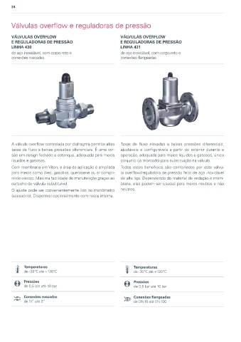A válvula overflow controlada por diafragma permite altas Taxas de fluxo elevadas a baixas pressões diferenciais, A alternativa para a versão de aço inoxidável feita de bron- Se forem necessárias conexões flangeadas, esta é uma